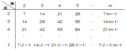 同じように,横を固定して縦の長さを変えても,対角の数の積の差は,7(m-1)となる。