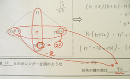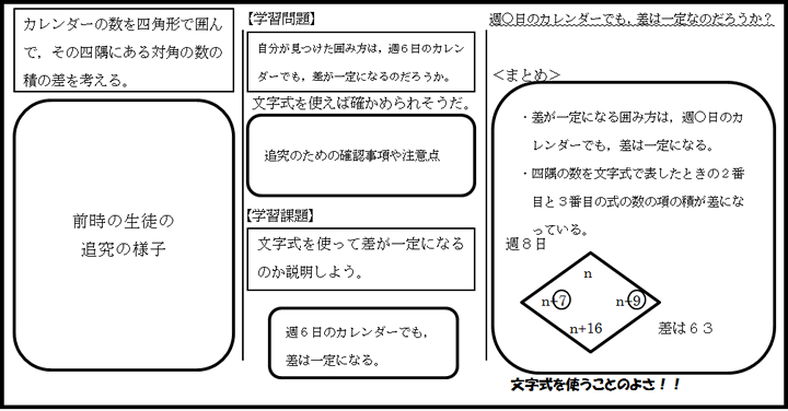 A生は,繰り返し文字式の計算を繰り返すうちに,式に隠れているカラクリを見出し,「計算しなくても差が一定になるかどうか判断できる」ことに気がついている。さらには「四隅の数を文字で表したとき,2番目と3番目の式の数の項の積が,差になっている」ことにも気がついた。このA生の気づきを全体に広げ,誰のカレンダーでも,誰の囲み方でも共通する性質としてまとめをした。