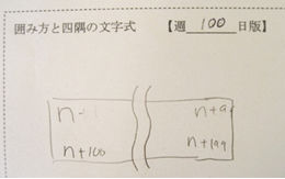 週6日でも自分たちの囲み方は差が一定になることを確認したら,「週○日のカレンダーでも同じことが言えるか」を考え,生徒自身が「週○日のカレンダーなら…」と自由に設定して自分の囲み方について追究を進めた。週5日や4日,8日や10日などで追究する生徒が多かったが,中には週100日ならどうかと調べる生徒もおり,自ら考えて追究する姿が見られた。(週100日などの場合は31日以降もあるものとした数表をイメージして追究を進めることとした。)