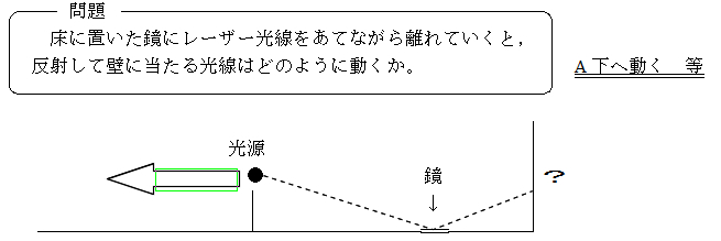 問題を投げかけ生徒に予想させる。この段階では上昇する,下降する等の意見が出るが,その関係性までは分からない生徒が多い。そこで実際にやってみる。だだし,そのままやると壁の点が下降することは分かるが,その関係性までは分からない。そこで,壁の点の軌跡が分かるように,鏡との距離を等間隔に変えた光源を複数準備(鏡も複数)して,これを横に等間隔で並べて一斉にレーザー光線を発射する。そうすれば壁に映しだされた点は双曲線を描く。それを生徒に発見させ,(壁に当たる光の高さ)は(鏡と光源の距離)に反比例していることに気づかせる。