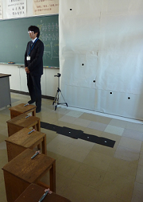 生徒は10分の1スケールの実験装置で(鏡から光源までの距離)×(壁の光の高さ)=48を得ているので,それを利用して答えを導くことができる。実験で式を導いた時点では正解を発表していないので,その式が正しいかどうかの答え合わせの意味合いもある。実際に生徒が予想した位置の壁にそれぞれポイントを記し,実際にやってみることで答えを確認する。生徒は実験によって得られた反比例の式を利用して問題を解くことができたことに喜びを覚えていた。