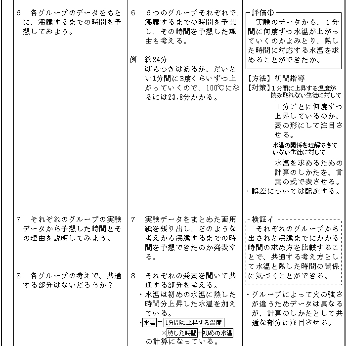 また,研究仮説(イ)に対しては,たとえ火力に差があり,グループごとの1分あたりの上昇温度が異なったとしても,各グループが出し合った実験データとそれをもとにした沸騰するまでの時間の計算のしかたを出し合って比較することで,計算を構成する式はみな同じ考えで,水温=1分あたりの上昇温度×熱した時間+はじめの水温になっていることに,生徒自らが気づくことができるのではないかとと考えた。さらに,グループで実験を行って考察するという過程をふむことは,グループの中でもお互いに沸騰するまでの時間の求め方に間違いがないか確認し合いながら学習を進められるという点でも,有効なのではないかと考えた。