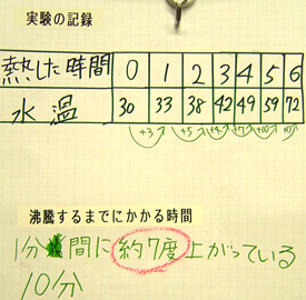 ところが,「途中までの実験のペースをふまえて考えた時,本当に25分もかかるのか」と考えさせた時,初めの時点ですでに30℃であったことに気づき,100℃になるには70℃上昇する時間を求めればいいことに気づいた。そうしたやりとりを通した上で,水温を求める際には,熱した時間×4(1分あたりの上昇温度)+30(初めの温度)を計算すればいいことに,自分達で気づくことができた。