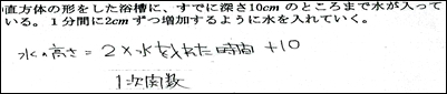 次の時間に,全グループの実験結果から水温を求める計算のしかたを確認させた。グループごとに1分間に上がる温度は異なるものの,すべて水温=1分間に上がる温度×熱した時間+はじめの水温の形で計算ができることを確かめた上で,「yがxの1次関数である」ということのまとめと練習問題を行った。