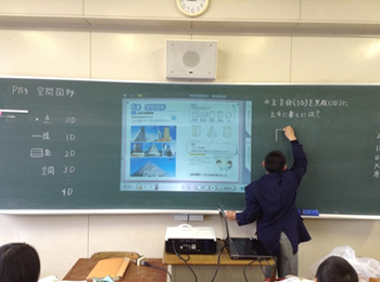 最初にデジタル教科書を使って,身の周りにある様々な建造物の例を紹介した。「その建造物が,おおよそどのような形をしているのか」という発問に対して,生徒達は活発に発言をした。そして,その立体の名称を確認し,実際の立体を見せた。やはり,身近にあるものを用いて導入を行うことは,数学が実生活と結びついていることを実感させるためにも大切である。