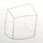 次元の話のあとで,「立方体(3D)を黒板(2D)に“上手に”かくには,どうしたらよいか」という課題を与え,生徒達は課題に取り組む。小学校の学習がいきていて,7割の生徒はポイントを押さえてかくことができるが,残りの3割の生徒は上手にかくことができない。右の図は,残念ながら上手にかけていない例である。ここでのポイントは主に二つあると私は考えている。