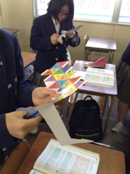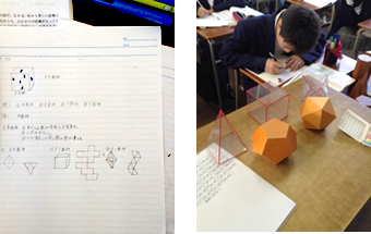 この範囲においてデジタル教科書を使うことにより,これらの立体を様々な角度から見せることができた。これは,奥の面がどのような形になっているかがイメージし難い生徒にとっては,大変有効だと思われる。デジタル教科書(バーチャル)と実際のものを見せたり作らせたりすることで頭を使い,理解を深めさせた。