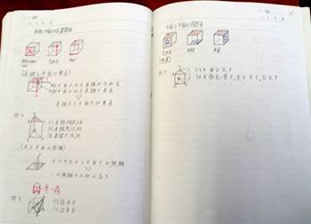 たとえば,「青色の割り箸と緑色の割り箸はどんな関係」などの発問ができ,ねじれの位置なども黒板の図を用いる方法よりこの教具を用いる方が説明しやすい。また,平面P上の交わる2直線にある直線ℓが垂直である,すなわち,直線ℓと平面Pが垂直であることも,上記の教具を使うことによって,垂直つまりは90°になっていることを生徒に見せやすいというメリットもある。さらに,右の図のノートのように空間内の直線と直線・直線と平面・平面と平面の位置関係が,この立方体ですべて表現できるという利点がある。