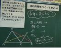 その後,グループで作り上げた問題を全体に提示することで,さらに発想が広がり,次時の証明をする場面への意欲につながった。