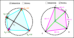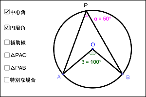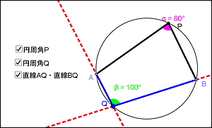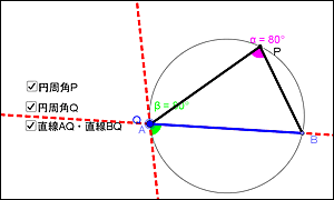 ・2つの円周角を直線ABに対して同じ側に表示したり,異なる側に動かしたりすることで,「円周角の定理」と「円に内接する四角形の性質」の関連を意識づける。 |