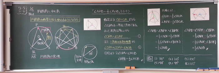 3 「円周角の定理」を証明する。 T1:何が証明できたら「円周角の定理」を証明したといえますか。 S1:円周角は中心角の半分になることです。 S2:「∠APB=1/2×∠AOB」です。 T2:点Pをどこにすると一番証明しやすいでしょうか。 S3:線が重ならないところがいいと思います。 S4:PA(PB)が直径になるようにすると,図が簡単になります。 -S4の方針で証明する- T3:この証明で,どんな場合でも成り立つといえますか。 S5:いえません。中心Oが∠APBの内部にある場合と,外部にある場合の証明が必要です。 |