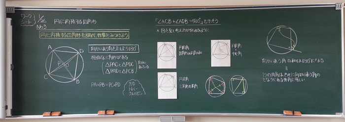 | 第3時 | 円に内接する四角形を考察し,既習の円に関する性質を利用して説明することができる。 | |