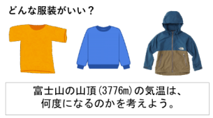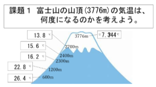 | 【課題1】富士山の山頂(3776m)の気温は,何度になるのかを考えよう。 | |