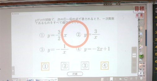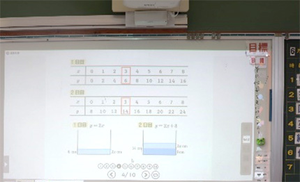 本校の普通教室は,黒板をホワイトボードに変え,プロジェクターを備えた電子黒板として利用している。数学科では,ほぼ毎時間デジタル教科書を使用して授業を行っている。デジタル教科書(啓林館「未来にひろがる数学」)は,生徒が使っている教科書をそのまま投影できるだけではなく,問題のところどころにフラッシュカードが組み込まれ,それを活用して,効果的に話し合い活動等を行い,習熟させることができる(資料1)。