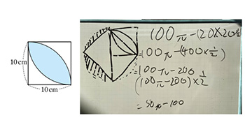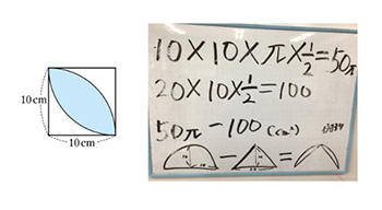 本校の生徒は「ミライシード」の「ムーブノート」を活用した。葉っぱ形の面積の求め方を図,言葉,式で表し,Zoomの「画面共有」を使って発表した(資料13)。近隣校の生徒は,ホワイトボードに求め方を書き表し,それをプレゼンテーションソフトの「Microsoft PowerPoint」に画像として貼り付け,「画面共有」を使って発表した(資料14)。
