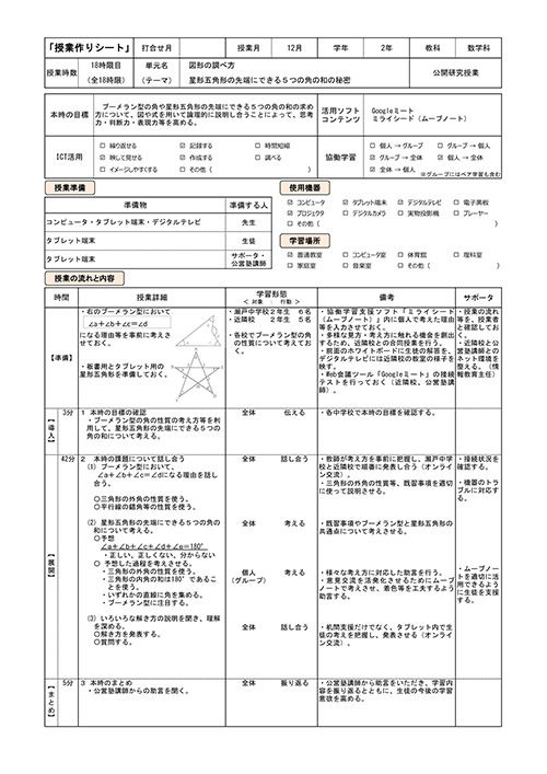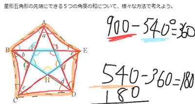 本校の生徒だけでも五つの解法が出たが,近隣校からは,別の解法が発表され,本校の生徒は,その発表を興味深く聞いていた。資料21にあるように,発表する場合は,パソコンの前に来て行った。その際,相手校の画面にはどうしても顔が暗く映ってしまうため,専用の照明器具を用意した。また,テレビ画面には,パソコン画面のGoogleミートの画面を,前面のホワイトボードには,ムーブノートの「みんなの広場」のそれぞれの解法を映し出して,授業展開した。 ブーメラン型の角度について論理的に説明し合うことは,思考力・判断力・表現力等を高めるだけでなく,次の星形五角形の先端にできる五つの角の和について考える際に働かせる数学的な見方・考え方の一助となる。つまり,星形五角形の角の性質を考える足掛かりとなる。