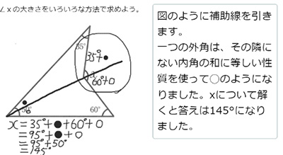 本時ではまず,資料20にあるようにブーメラン型の図形において,三つの内角の和は,外側の角の大きさに等しいことを,様々な方法で説明させた。