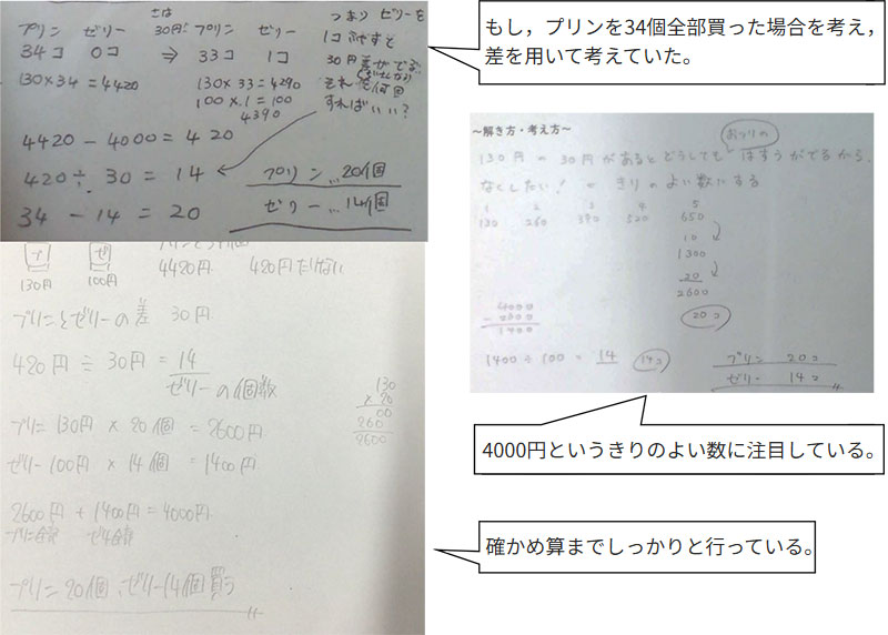 このように,本単元は,数学的な見方・考え方を働かせ,数学的活動を通して,数学的に考える資質・能力を高めることができるよい教材であると考える。単に,答えが出せれば良いわけではなく,どのように考えたかに焦点を当て,それらを比較検討し,主体的で対話的な深い学びの実現を目指している。