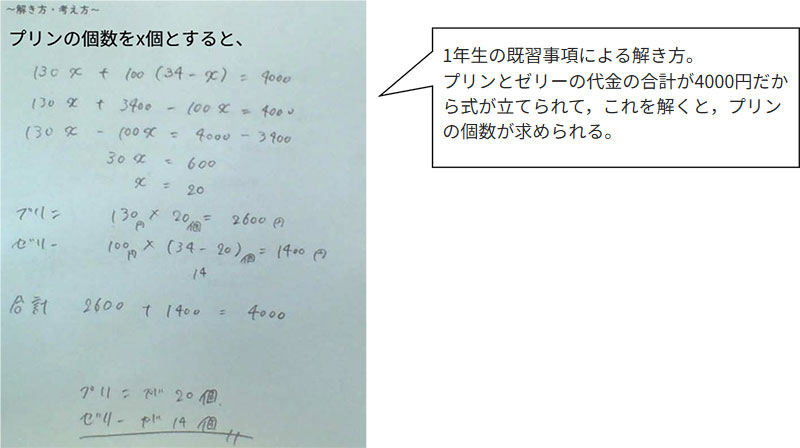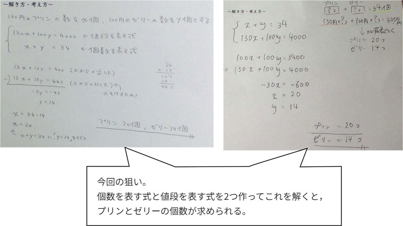 例題 1個130円のプリンと1個100円のゼリーを合わせて34個買い,ちょうど4000円になるようにしたい。プリンとゼリーをそれぞれ何個ずつ買うといいでしょうか。 |