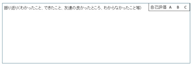 田村(2018)によると,振り返りは,学習内容を確認し,既習内容と関連付けることができ,自己の変容を自覚することができる。つまり適切な振り返りによって,理解が深まるとともに,学習したことを他の学習や生活に生かそうとする態度を養うことができると考える。そこで,授業の終わりに本時の学習について振り返りシートにまとめる活動を設定する。この振り返りシートには「分かったこと」「できたこと」「分からなかったこと」「友達の良かったところ」について記述させる【資料2】。「分かったこと」「できたこと」「分からなかったこと」からは,学習内容の理解度を見とり,次時の指導へいかすことができる。「友達の良かったところ」として他者の考えを振り返る視点を入れることで,生徒は,自分と異なる考えを得たり,自分の考えを深めたりすることができる。
