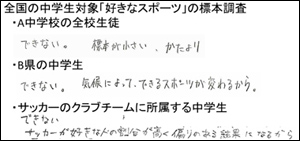 (1) 「全国の中学生対象,好きなスポーツ」の調査において,標本の取り出し方が適切か考える。 ・A町の中学生