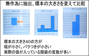 次に,標本の大きさの重要性を理解できるように,実際に標本調査を行い,箱ひげ図やヒストグラムを比較して標本の大きさを変えると結果がどうなるか調べる活動を行った【資料6】。話し合い活動の中では,標本の大きさは大きい方が良いという考えをもった生徒が多かった。しかし,大きすぎたら調べるのに時間がかかり,意味がないという標本調査の特徴を考えて発言している生徒もみられた【資料7】。