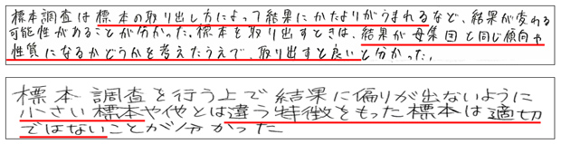最後の振り返りでは,学習内容を確認するためにわかったことを記述させたところ,【資料8】のように標本の取り出し方に関する記述が多くみられた。
