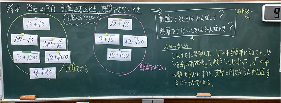 の中を簡単にしてから計算すること」や「分母の有理化をしてから計算すること」を,教師から教え込んではいなかっただろうか。「数と式」領域の,特に計算場面では,教師が一方的に計算方法を伝えていく展開が多いように感じられる。「中学校学習指導要領(平成29年告示)解説 数学編 第3章 第3節 第3学年の目標及び内容」には,「既習の数や文字式の計算の方法と関連付けて,平方根を含む式の計算の方法を見いだしたり,数の平方根を具体的な場面で活用したりできるようにする。」と明記されている。