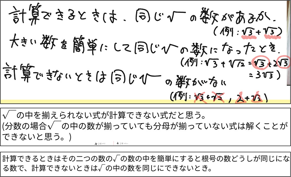 生徒のふりかえりの記述から,既習の数や文字式の計算の方法と関連付けて,平方根を含む式の加法の計算の方法を見いだしていることが分かる。今回は,複数の平方根を含む式を「計算(まとめることが)できる・できない」で分けるという課題をまず提示した。そうすることで,生徒からどうすれば計算できるのかという問いが自然と湧き出ており,ねらいにせまる手立てとして有効であったように思われる。