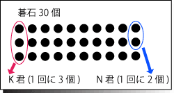 | 下の図のように,30個の碁石が並んでいます。今,K君とN君の2人がいます。 次のようなルールで「さっさ立て」(日本の昔からの遊び)を行いました。 |