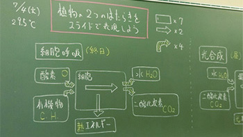 光合成のはたらきについては小学校でも学んでいるが,ここでは呼吸との比較を行い,気体と水の出入りについて共通することがあることに気づかせた。