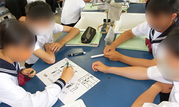 着席後は,各グループにホワイトボードを渡し,実験内容を簡潔に記すよう指示した。その際,「人に伝えること」を意識し,図で説明するよう促した。
