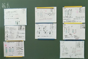 グループの実験内容を描いたホワイトボードを黒板に並べ,順番に発表を行った。自分が行っていない方の実験についても,実験前の各自の調査や事前の説明等で予備知識があったため,内容を概ね理解することができた。