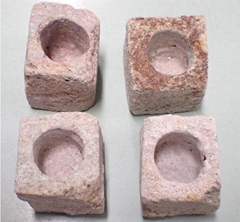 半透膜としての黒雲母流紋岩の容器は,慣れれば1個約20分で削って作ることができる。半透膜としての黒雲母流紋岩の代わりに水に浮く軽石を使用したが,硫酸銅水溶液がしみ出てしまい,実験で使用できなかった。密度が重要であり,約2g/cm3の密度であれば,石の中に電解質の水溶液と反応する物質がないことを確認する必要があるが,他の石でも可能であると考える。黒雲母流紋岩を切削工具で削ることが必要であるが,石ではなく珪藻土を半透膜として使用することができ,石と比べて容易に削ることができる(図7)。