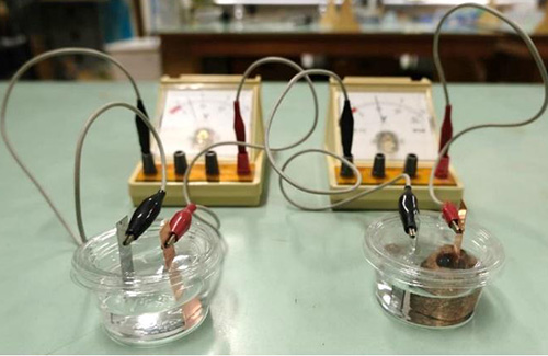 a.ダニエル電池(右)とボルタ電池(左)の様子