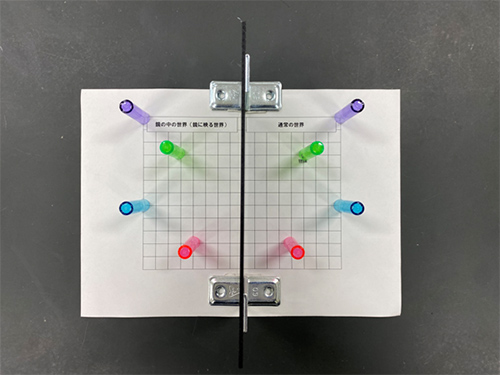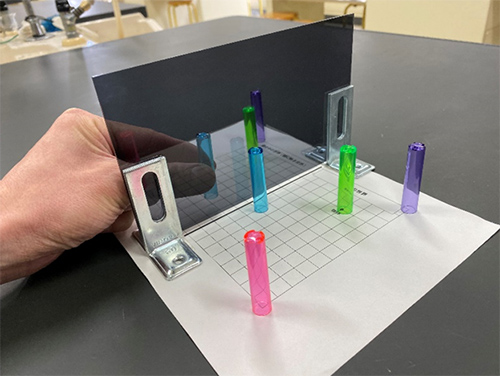 鏡の前に立つと,鏡に自分の像が映るが,鏡に映る世界に入り,自分の像から鏡までの距離を測定することはできない。しかし,ハーフミラーの特性(光を反射もするが,透過もする)を活かすことで,生徒が物体と鏡に映った像の位置の関係性を見いだすことを手助けすることができた。