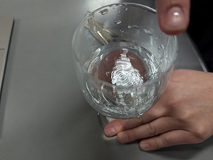 図1 グラスハープで音を発生させている様子(水面が振動しているのが確認できる)