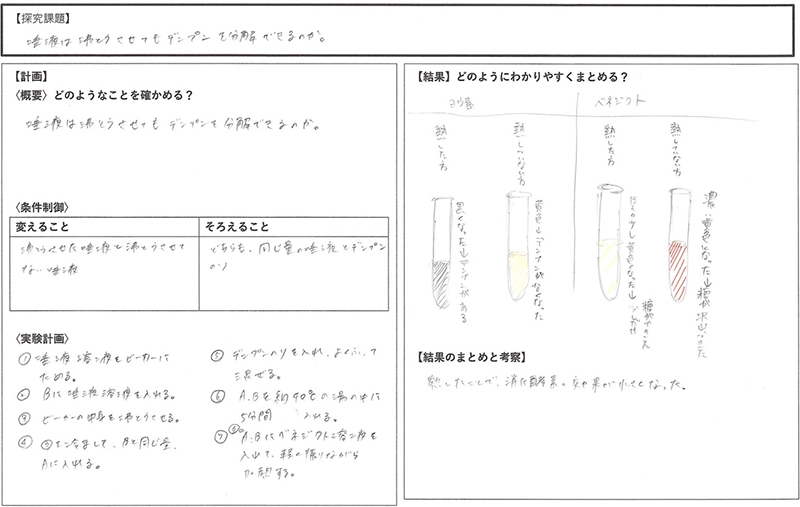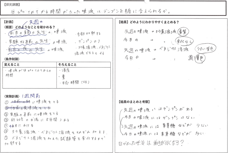 はじめは「デンプンの量を変えて実験するとどうなるだろうか」のように,条件設定をそのまま課題とする生徒も多く見られた。立てた課題を発表し合う際に「何を確かめたいのか」の意図を他の班に説明することを通じて,課題が明確なものに修正されていった。