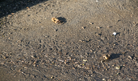 そこで,今回の授業では「現在の生物の生痕」(図3,図5,図6,図7)と「生痕化石」(図4,図8)を結びつけて観察を行うとともに,水たまりや水田が干上がった時に見られる「乾裂」(図9)のような「物理現象」の痕跡は「化石」と呼ばないことを強調した。すると学習者は化石の定義を正しく理解することができていた。