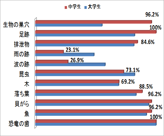 アンケートの結果,「恐竜の歯」や「貝殻」や「魚」などの正解率が非常に高いのは大学生と共通だが,大学生の正解率が低かった「生物の巣穴」も,中学生は96.2%と正解率が高く,「足跡」の正解率は100%であった。また,「雨の跡」や「波の跡」などの物理現象の痕跡を化石だと思う割合が,それぞれ23.1%と26.9%と少なく,「生痕化石」を用いた授業を行った中学生は,化石の定義を正しく理解していることがわかった。