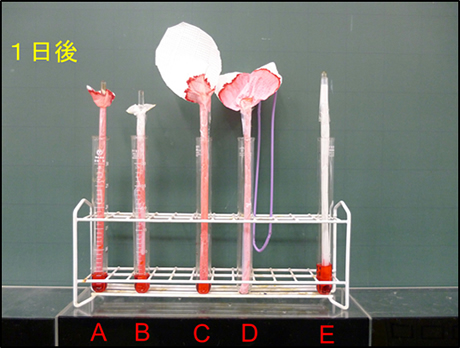 [3]A~Eをそれぞれ着色した水が入った試験管の中に入れる。(AとCはすぐに水を吸い上げるので,吸い上げがある程度止まってから,着色した水の量を同量に調整し,それぞれに油を少量加える。)