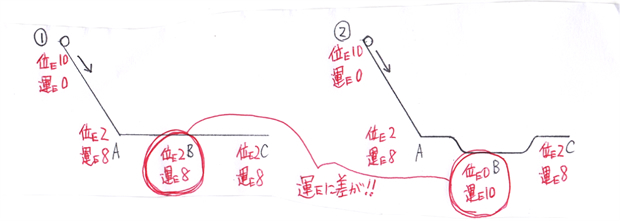 結果は②のコースの方が早くゴールする。