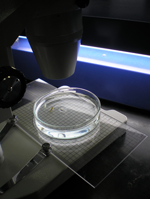シャーレの下に5mm方眼シート(アクリル板)を置くと,拡大撮影した画像の倍率がわかる。