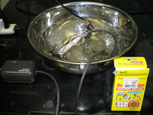 2リットルペットボトルをくりぬいて簡易水槽を作る。水は,くみ置きのものを1日おきに替える。
