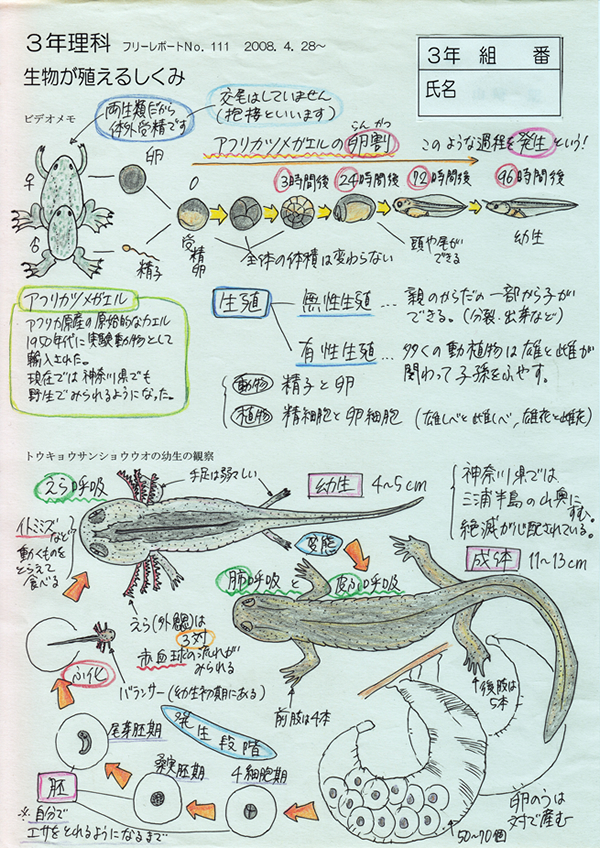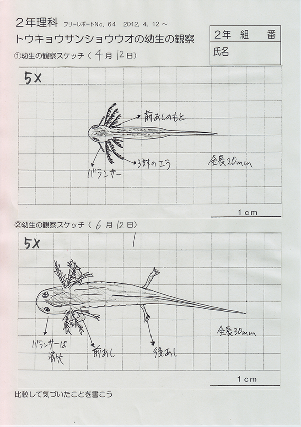 2ヶ月の間,係の生徒に理科室で約100匹のサンショウウオ幼生を飼育させ,2ヶ月後の授業で再び同一個体を観察させる。レポートの下半分にスケッチさせ,レポートを完成させる。その際,「変化がわかるようにスケッチすること」を注意点としてあげておけば,大きさの変化のみならず,エラの様子や,前あし,後あし,バランサーの変化など,よく観察しながら記録しようとする。
