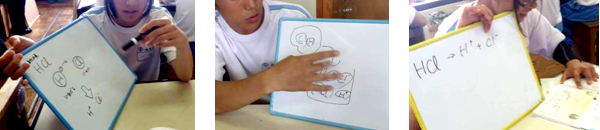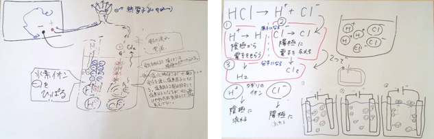 T「説明とミクシは十分できましたか。次の授業では実験をします。課題は,「塩酸に電極を入れ電流を流したとき,電極と水溶液の変化をまとめなさい。」です。班ごとに実験計画を大きいWBにまとめ,許可を得て実験を行います。計画を立てるとき,今日の授業で疑問に思ったり,大切だと思ったりしたことをしっかり確認し,WBに追加して説明します。薬品を扱いますから体育着で来なさい。」