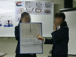 *自分の考えを既習事項を用いて表現できているか。 ・実験方法の確認(磁気プローブ,磁界視覚化教材) ・検証実験に必要な物品を配布する。 |