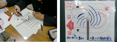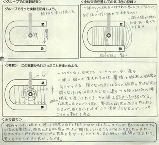 ・力がはたらく理由を既習事項から予想する。 ・予想について他者の考えを参照する。 ・予想を確かめる(検証実験の)ためにどのような方法にするとよいのかを既習事項をもとに考える。 ・磁界の中でコイルに電流を流した時の磁界がどのようになっているかを表わす。 |