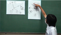 | 第1ステージ(基本的なことを共有する場面) ウインドカーに扇風機の風を当てて,風下に走らせる。その後,風上に向かって走らせる方法を考える。(グループ) 第2ステージ(高い課題に挑戦する場面) 風上に向かって走る理由を考える。(グループ) |