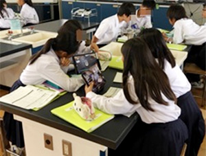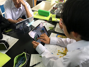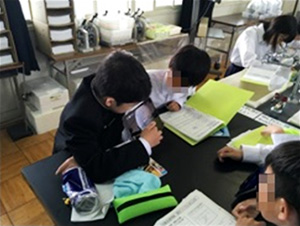 ムラサキツユクサの葉の裏の表皮にある気孔を顕微鏡で観察し,iPadで撮影する活動を行なった。顕微鏡画像はiPadのカメラレンズを顕微鏡の接眼レンズに直接つけることで撮影することができる。孔辺細胞や気孔のつくりが説明しやすい画像を撮影しようとグループで協力しながらピントや明るさを調節する様子が見られた。撮影後は他のグループと画像を見せ合いながらつくりについて互いに説明し合う活動を行なった。活動では,説明する前に画像の余計な部分をトリミングしたり,ズームすることでよりわかりやすく伝えようとする姿が見られた。